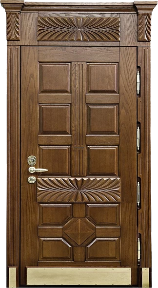 Поговорим об отделке. Вариантов декора дверей много. В большинстве случаев, для отделки элитных дверей используется массив натурального дерева или натуральный шпон с фрезеровкой. Цвет двери так же делается по желанию заказчика. Очень красиво и представительно выглядят двери с ковкой и стеклом.